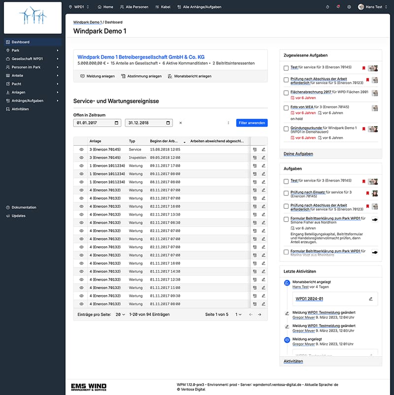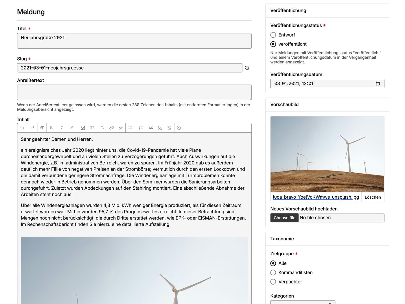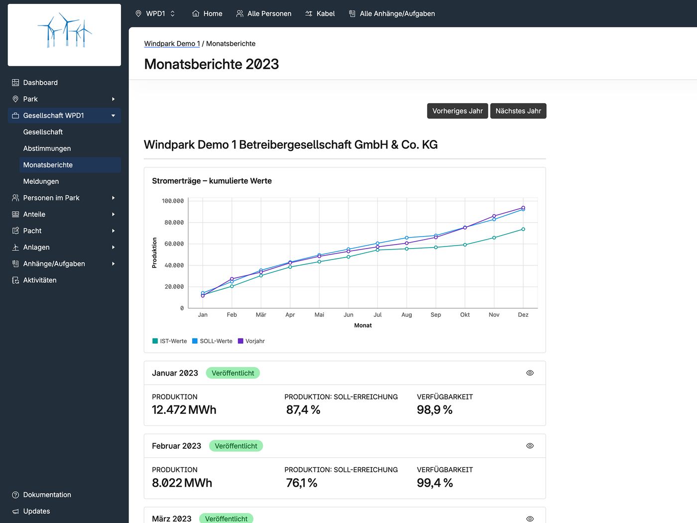 Nutzen Sie den internen Bereich für die Bereitstellung von Monats- und Quartalsberichten, um Ihren Anteilseignern einen Überblick über den Betrieb und Ertrag des Windparks zu geben.